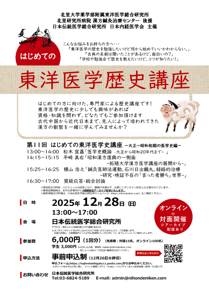 【「第11回はじめての東洋医学歴史講座ー大正~昭和初期の医学史編ー」開催のご案内】